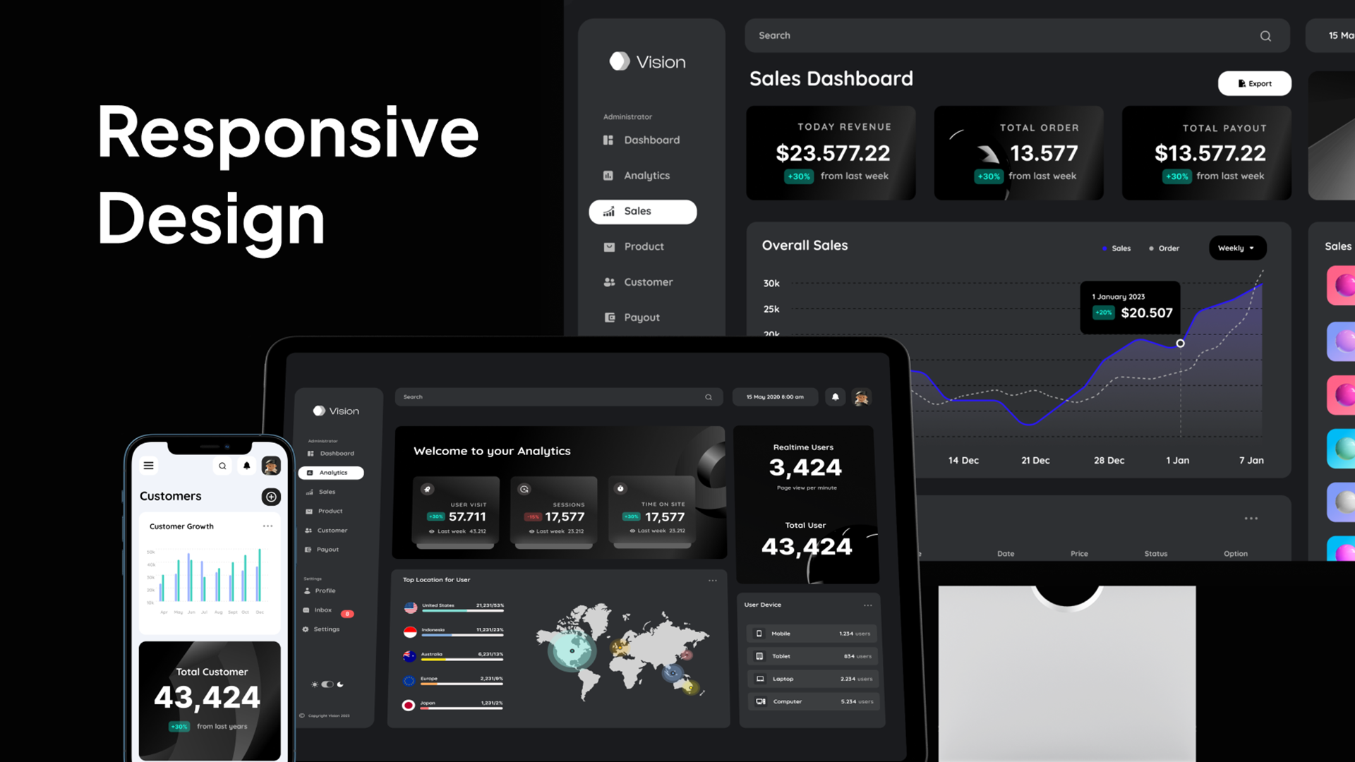 Vision - Marketing Dashboard UI Kit delivers 100+ high-quality screens, a complete design system, and sleek light & dark modes, all designed for seamless customization, full responsiveness, and effortless workflow.
