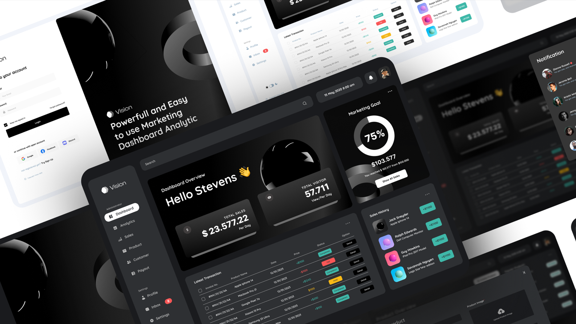 Vision - Marketing Dashboard UI Kit delivers 100+ high-quality screens, a complete design system, and sleek light & dark modes, all designed for seamless customization, full responsiveness, and effortless workflow.